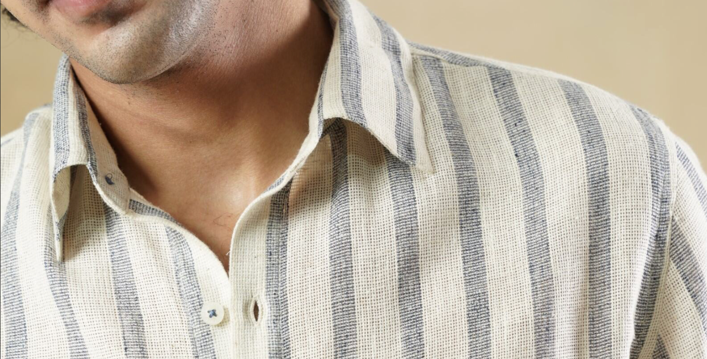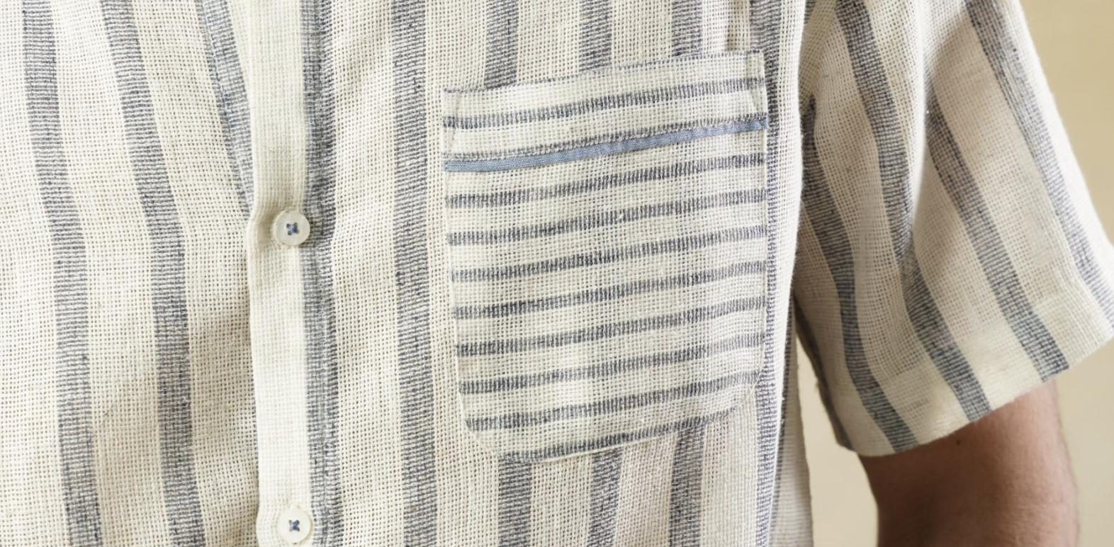 Relaxed half-sleeve shirt crafted in breathable jute cotton with bold vertical stripes and contrast pocket.