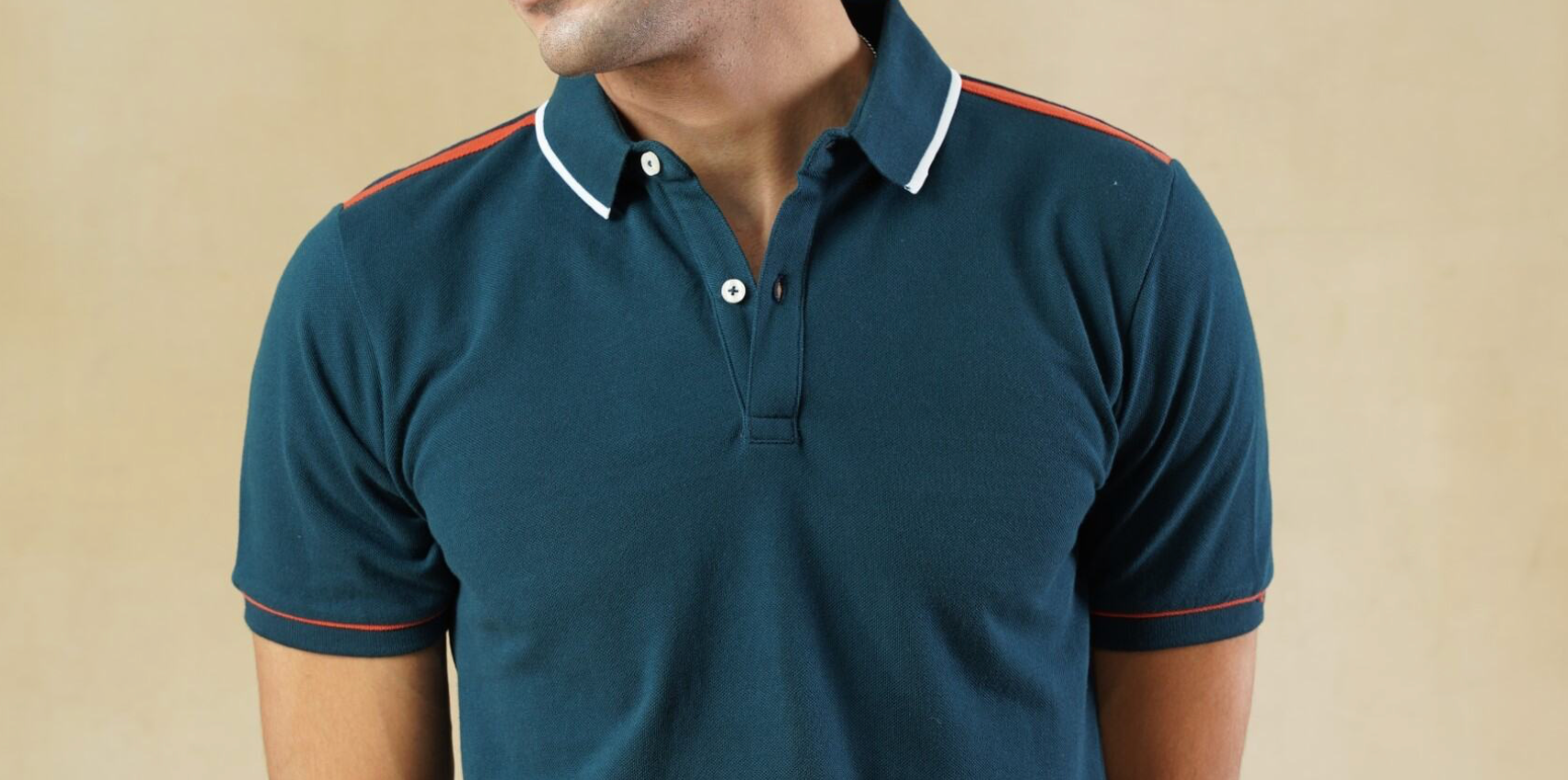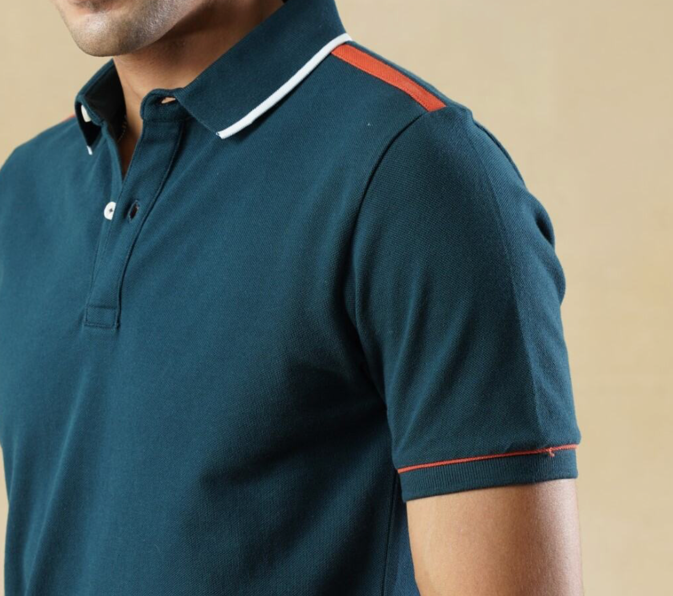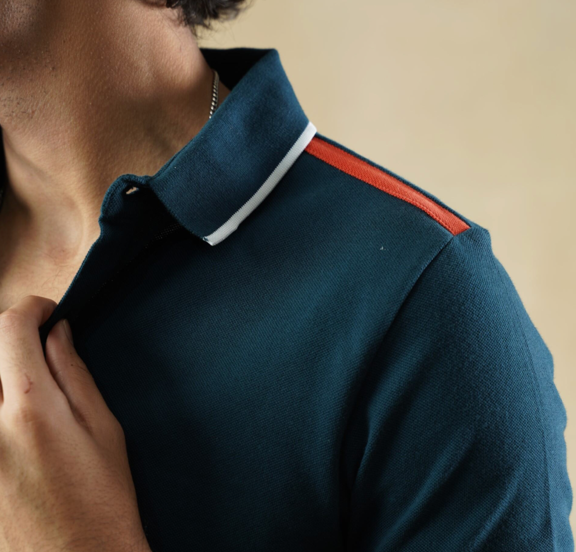 A teal polo shirt with contrast tipping and a bold shoulder patch—crafted for modern movement