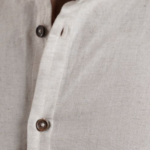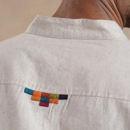 An earthy, classic summer shirt with a multi-coloured embroidery on the back.