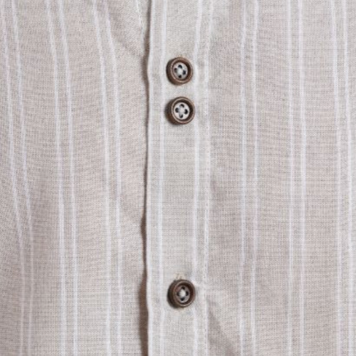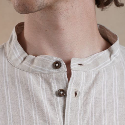 A striped cotton linen shirt with wooden button accents and subtle back embroidery.